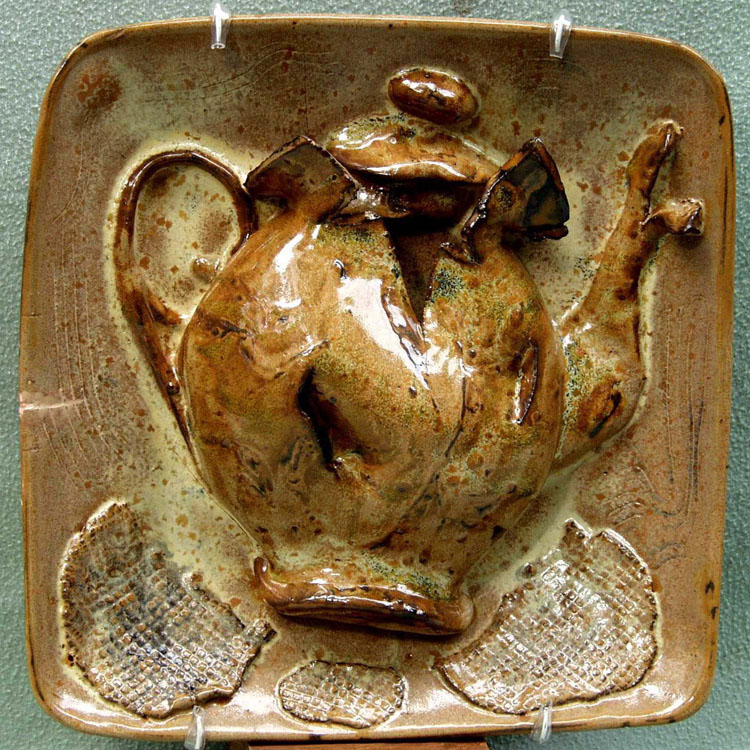 # 0278. Platter. Teapot. Stoneware slip-cast, altered, 12 x 12 in, 1999