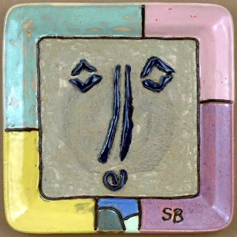# 0735. Plate. Mask. Thrown and altered stoneware, 9.5 x 9.5 in, 2015