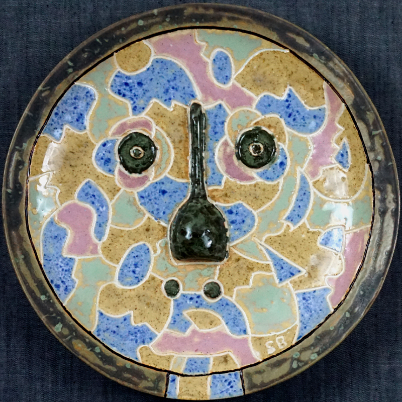 # 1014. Plate. Mask. Thrown stoneware, d. 10.5 in, 2022