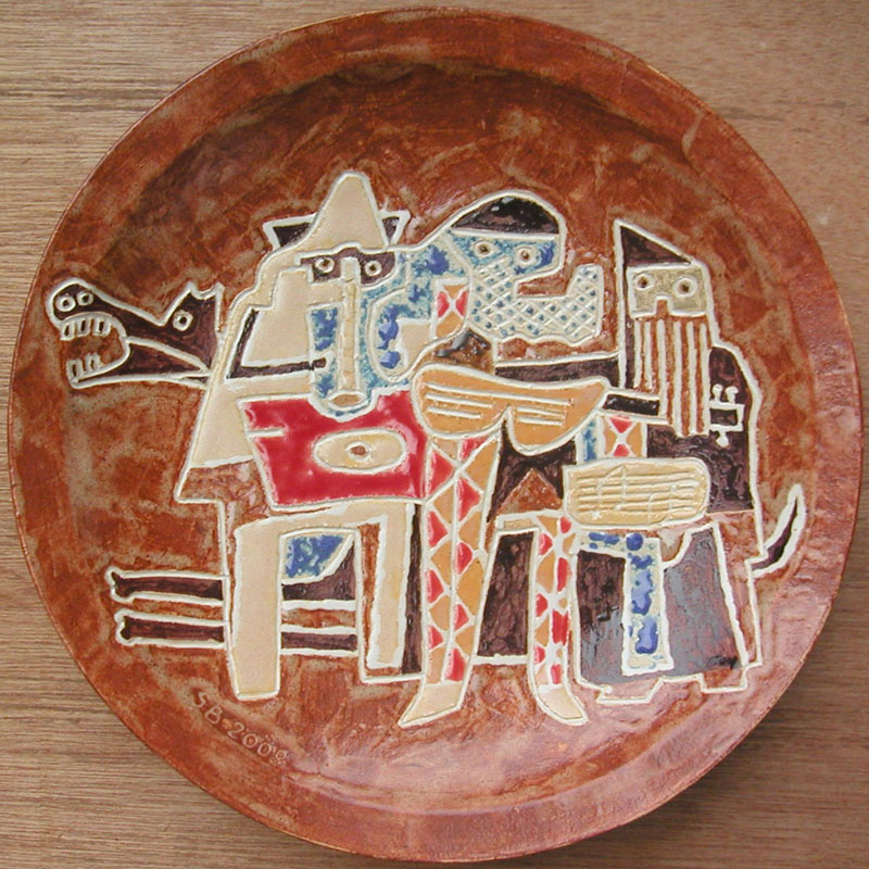 # 0472. Plate. Requiem for Guernica (after Picasso). Thrown stoneware, d. 10.5 in, 2008